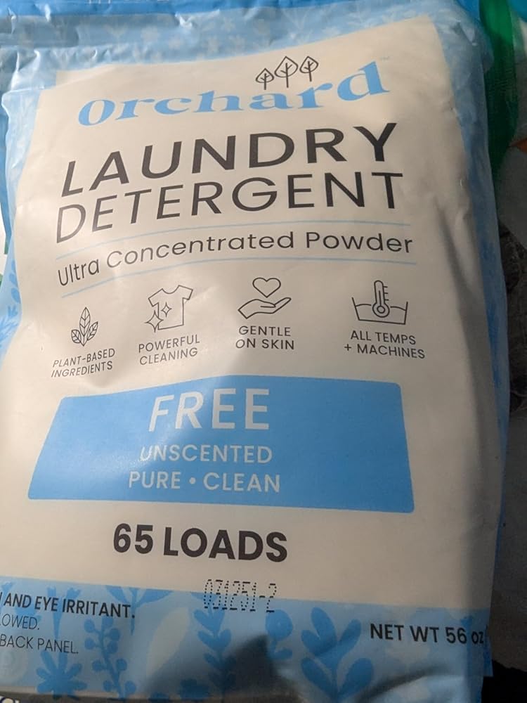 I was a little bit concerned when I got the orchard laundry detergent Ultra concentrated powder because it is unscented. Normally, I do like to have a light scent in my laundry because I feel like it's fresher and sometimes I just enjoy the nice smells.I am trying the unscented one which I don't normally do and I was a bit concerned that if my clothes were overly soiled, that I would not be able to get a true clean and that even after washing, anybody could smell that the clothes were not fully cleaned.Fortunately, I did not have that problem with the orchard laundry detergent because I agree that it is "ultra concentrated" (although whatever that means) and it did get all the smells out from my larger than average laundry load.You basically just pour this into your washing machine and call it a day at that point. I have a high efficiency washer and I did not experience any issues with using this particular detergent powder. I normally use detergent powder because I find it to be more cost effective than the liquids. And worst case I can just pour a little bit more and not have to worry about how much I just spent in terms of laundry.The orchard laundry detergent comes in a nice bag and you can just easily add whatever you need (which generally is going to be less than this dated amount that you need to use on the bag) and be rest assured that your clothes will come out clean.In terms of a price to performance, I think the value is definitely there, although I would recommend that you pick it up on sale. It's not overly expensive, but because it's natural and you're not buying a large quantity, I do find it to be a little bit more expensive than it needs to be.