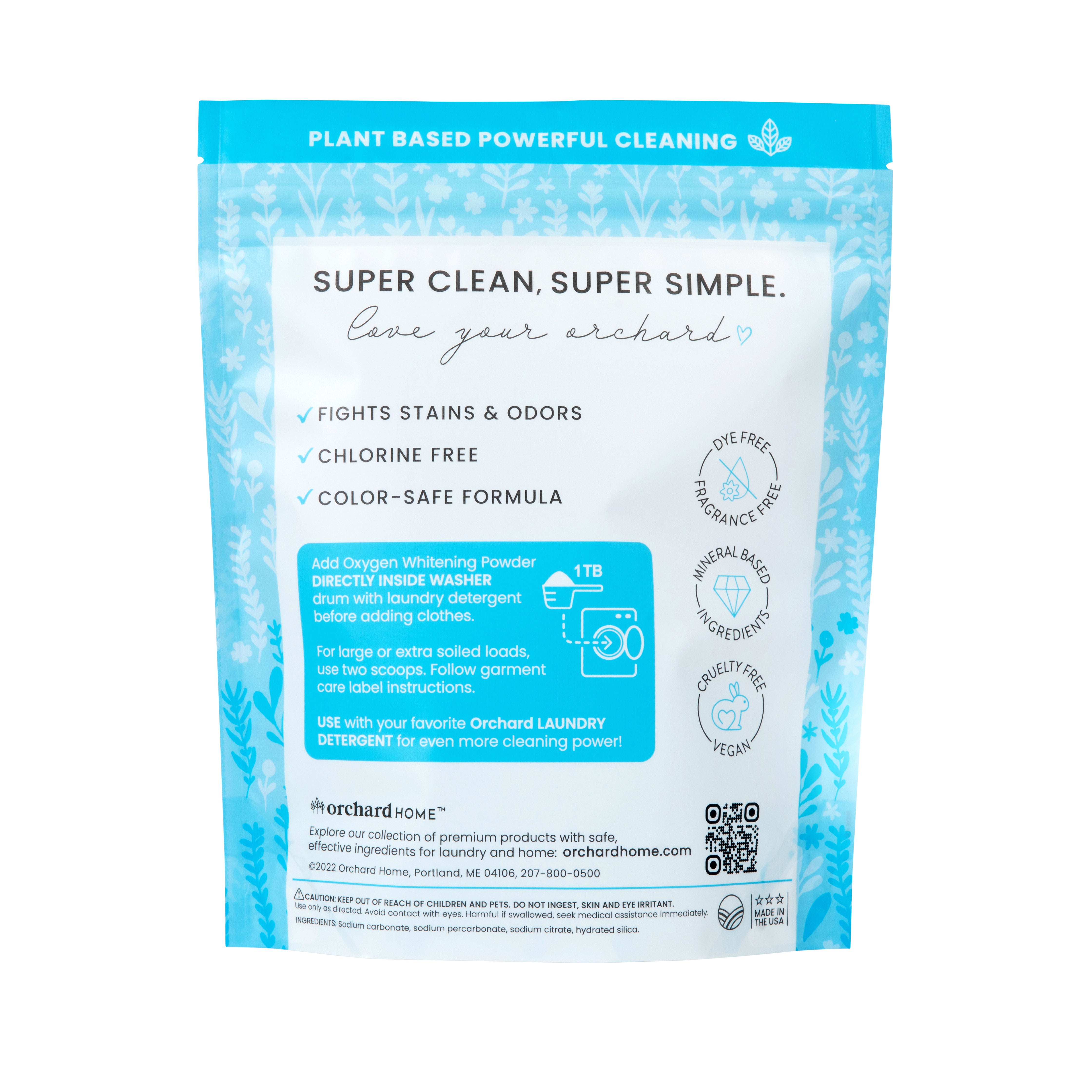 Oxygen bleach excels at organic stains like sweat, food, blood, body soil, and yellowing. Safe for most colors – great for cloth diapers, whites, and brights. For grease or oil-based stains, pair with Orchard detergent for best results.